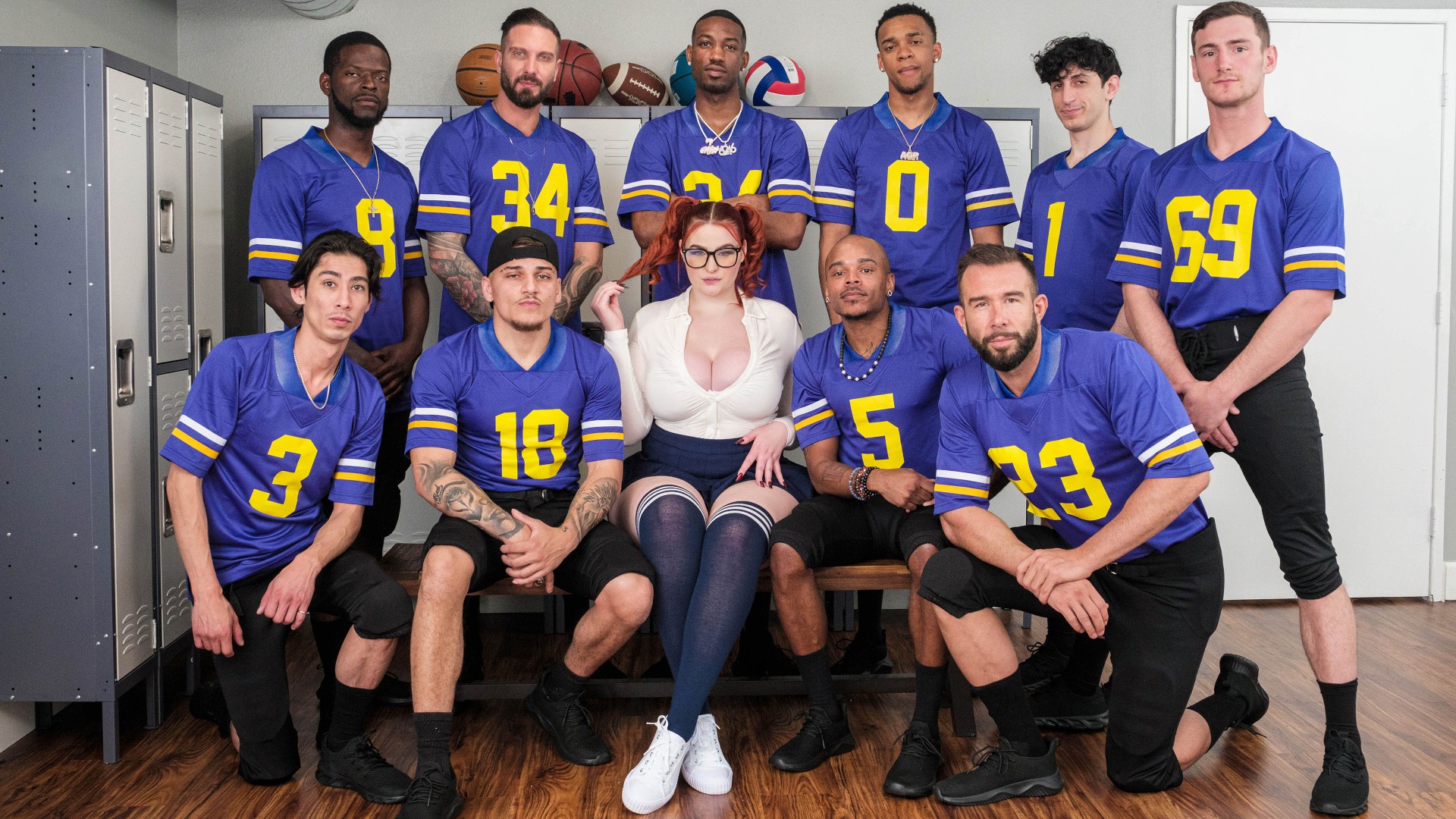 Abigaiil Morris is a seemingly shy nerd but she’s a slut deep down inside. She sneaks into the men’s football team’s locker room, where she masturbates while peeping on one of the team’s stars as he gets changed. Abigaiil makes too much noise and gets caught. He sees that the hot nerd is horny and after pressing her a bit, gives her what she wants: a blowjob. Soon the rest of the team enters, and like a revolving door they all join in on the action, leading to Abigaiil’s first blowbang!