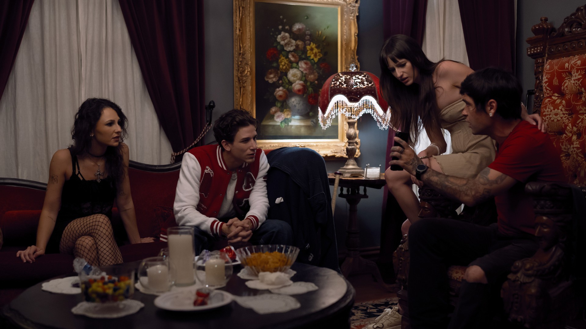 Sexy goth Emmy (Liz Jordan) just wants to spend her birthday watching horror movies, but her best friend Sadie shows up with a gift of a slinky dress, and tells her to put it on, because she invited Emmy's crush over. Sadie's boyfriend Benny and his friend Scott (Parker Ambrose) arrive with shocking news... there's been a murder nearby! When Scott's jealous ex Tara shows up just before they hear the masked killer has struck again, the college students lock themselves into the house. Scott joins Emmy in her bedroom and gives the hot goth the birthday present she really wants, kissing and undressing her on her bed before making her cum with his big cock. But as they get dressed again, they hear screams from downstairs! Will Emmy's birthday turn into a nightmare?
