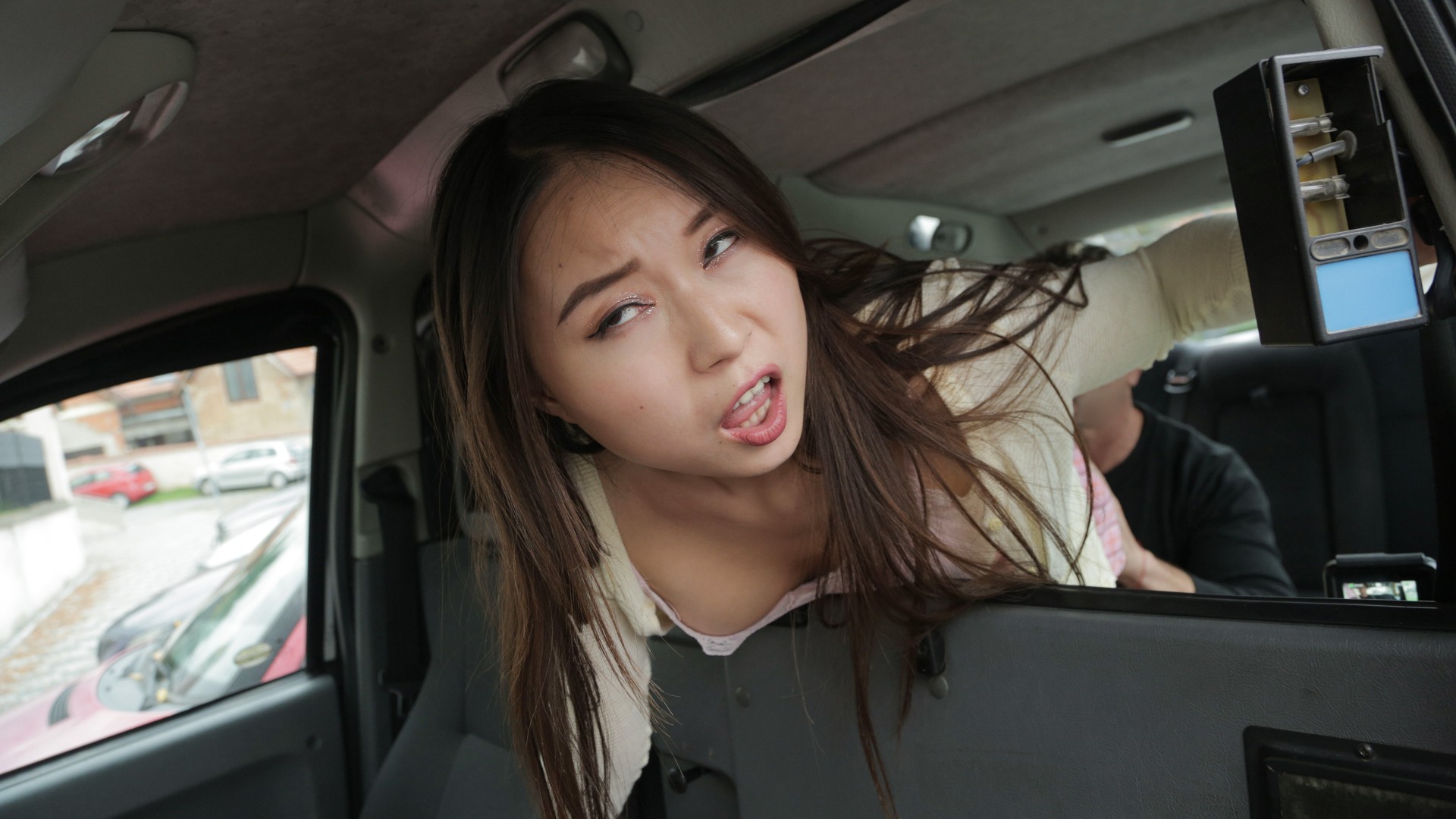 This lovely Chinese woman got into the taxi today named Yiming Curiosity. Yiming was visiting London from China, and asked me to take her to Buckingham Palace to do some sight seeing. I caught her eating in the backseat, and did not want a mess, so I asked her to put her food away. I kept catching her eating, and finally, she spilled chips all over the car! I was angry, so I pulled over to give her a piece of my mind. Trying to run away from me, she threw out her back, and asked me to call an ambulance. I had an idea of my own to help her, and starting to finger and lick her ass and pussy. All of a sudden, her back was better, and she was riding my cock. Yiming deepthroated my dick and gave me a sloppy blowjob, then put her tits in my face and she rode me cowgirl style. Finally, I fucked her doggystyle until she came, then pulled out and jizzed on her ass.
