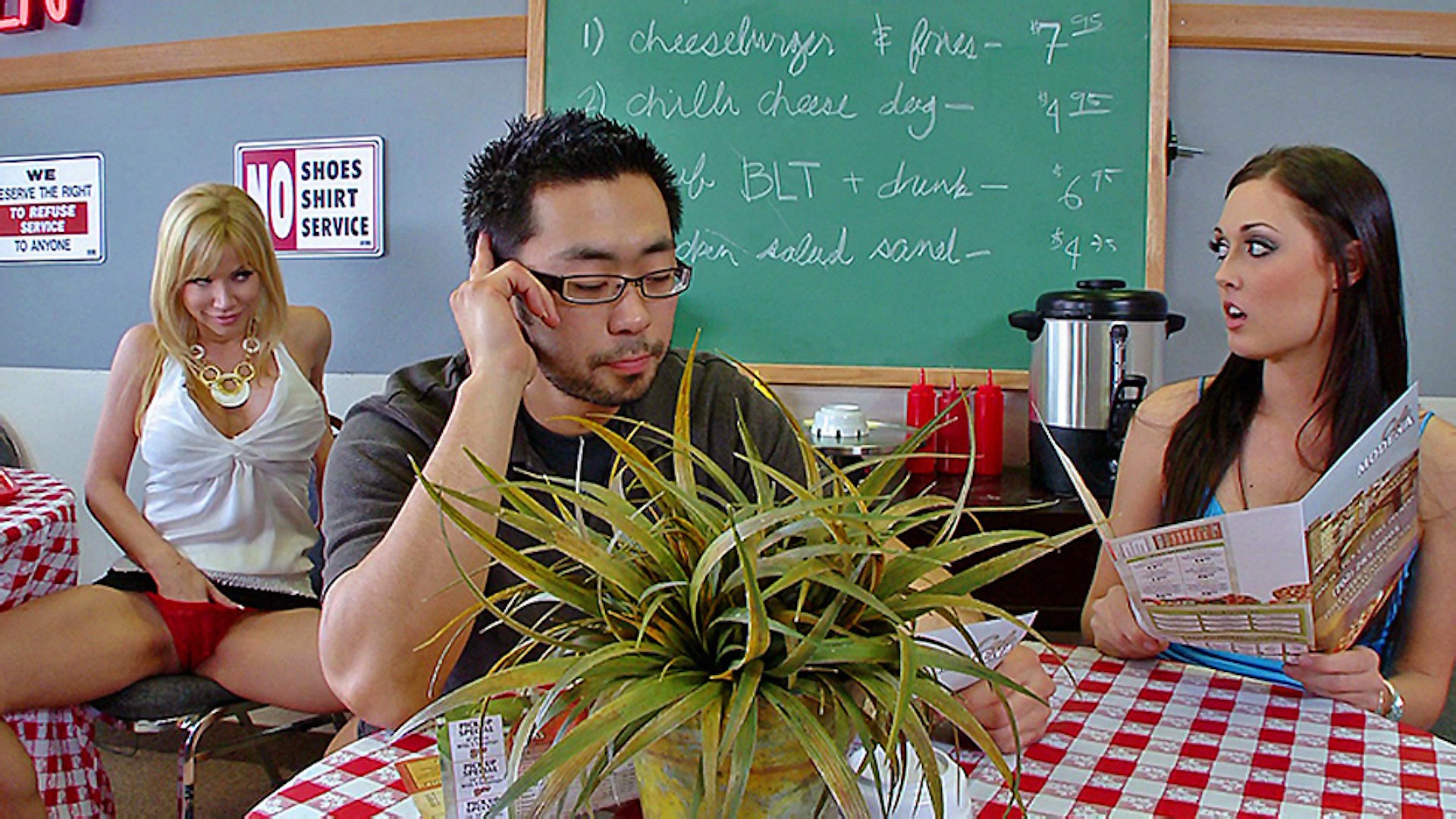 Melissa's at a restaurant with her man. She spots Angie checking out her man. This sends Melissa into a jealous fit. Melissa follows Angie to the bathroom to confront her. She finds out that Angie isn't looking at her man; she's been checking out Melissa the whole time. This infuriates Melissa even further and she decides to discipline Angie for her audacity!