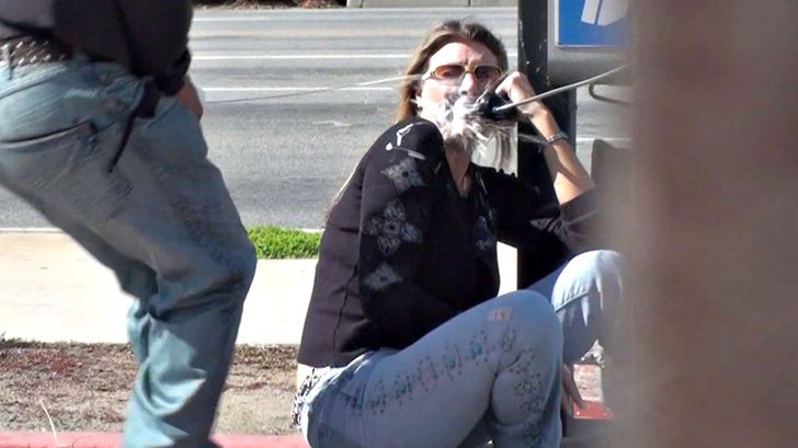 This biker chick MILF was hanging out on the fuckin pay phone. What the fuck, did she just get out of jail or something? Who the hell uses a payphone these days. Anyways my boy ran up and busted a nut all over her trailer park face. It was fucken classic!